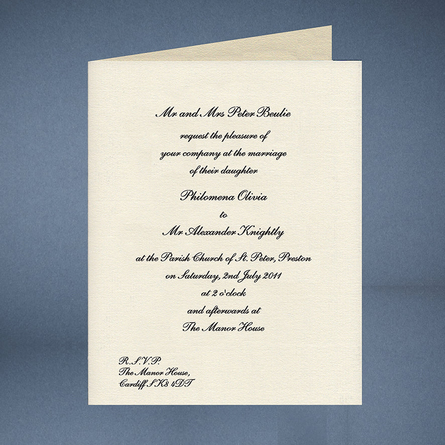 Traditional Wedding Invitations with matching envelopes. White or pale cream cards folded with the text printed on the front. Browse the ink colour and font options to make it your own!